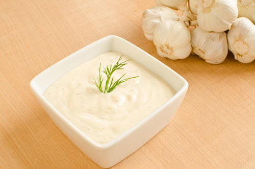 Olivenöl, geschälte Knoblauchzehen, Ei, Senf, Zitronensaft, Salz und Pfeffer in ein schmales, hohes Gefäß geben.