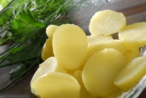 Kartoffeln schälen und in Scheiben schneiden. Diese in die Sauce geben. Mit Muskat abschmecken und mit der feingehackten Petersilie bestreuen.