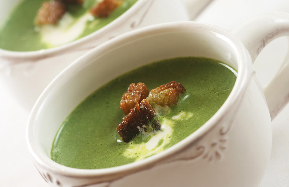 Nun die Hälfte der Erbsenpürieren und die andere Hälfte am Stück in den Topf geben. Und auch die frischen Kräuter welche kleingehackt werden in den Topf geben.