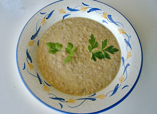 Lauch waschen, in feine Ringe schneiden, in einem Topf in etwas Olivenöl leicht anschwitzen, dann mit Gemüsebrühe auffüllen. Das angebratene Hackfleisch dazugeben.