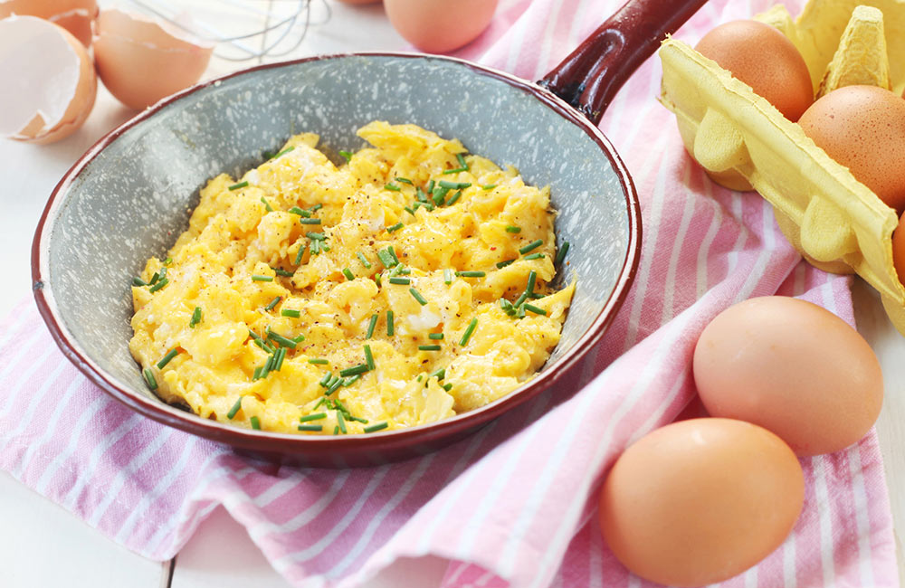 Die Eier mit der Milch in einer Schüssel mit der Gabel verquirlen. Parmesan und Schnittlauchröllchen zugeben, mit Salz und Pfeffer würzen.
