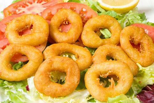 Tintenfische im Teigmantel auf spanisch Calamares a la romana werden in Spanien in vielen Strandlokalen angeboten. Die Zubereitung ist denkbar einfach! Tipp: Zum Braten und Frittieren Olivenöl mit 0,4 %!